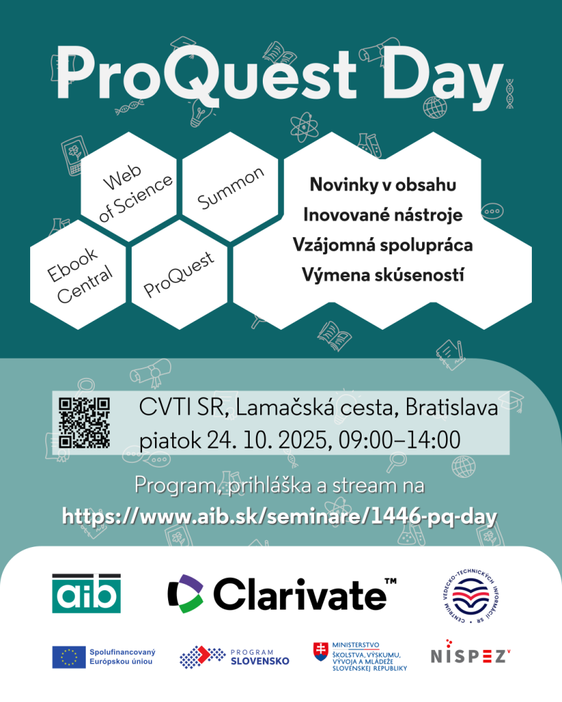 Web podujatia a registrácia: https://www.aib.sk/seminare/1446-proquest-day-stretnutie-pouzivatelov-proquest-a-web-of-science/